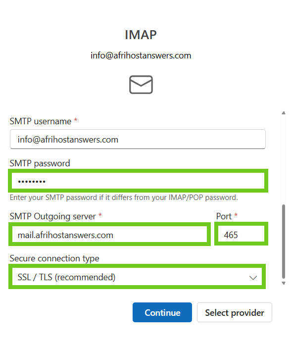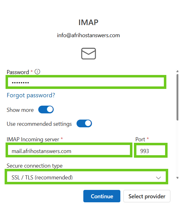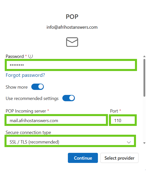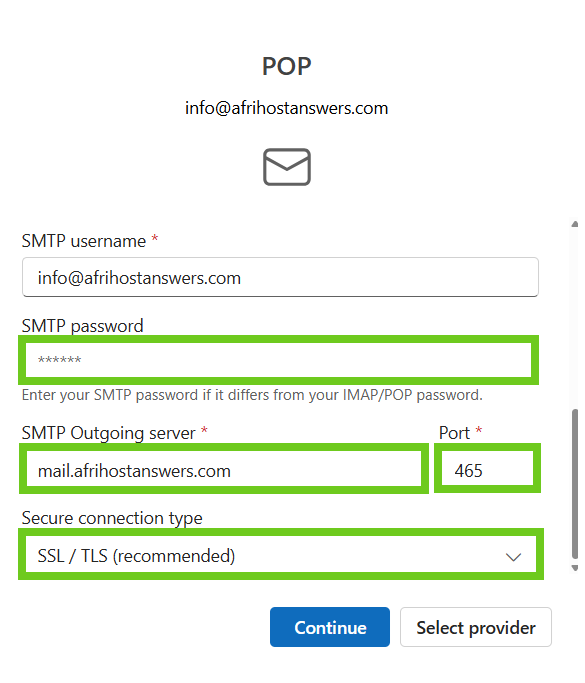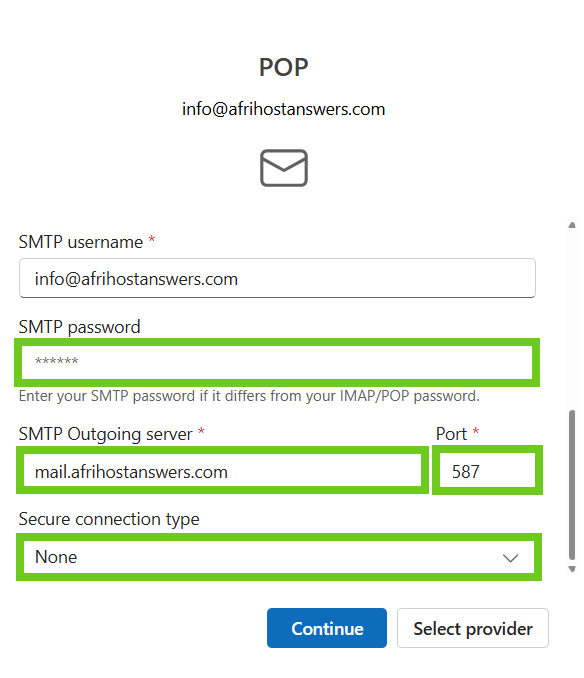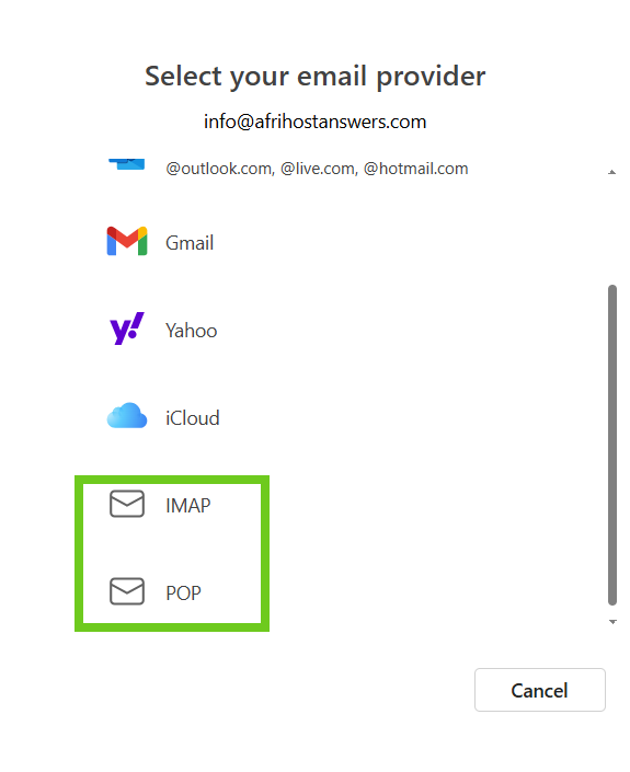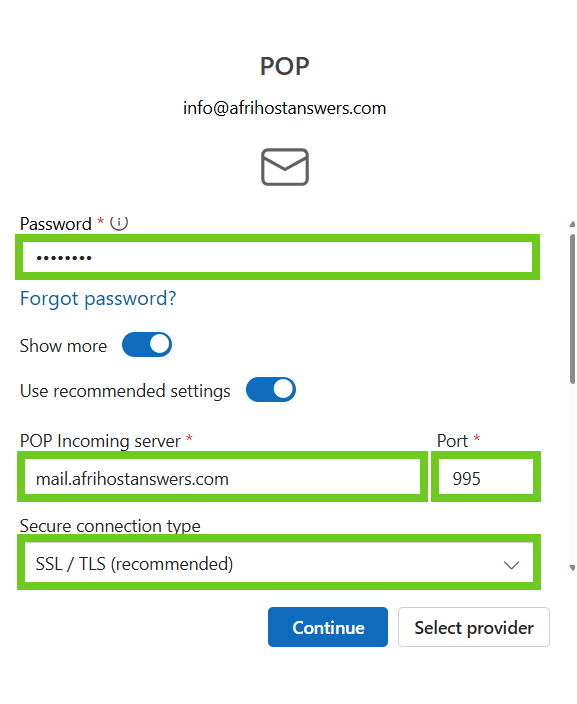 - POP or IMAP settings can be changed when you choose the 'Select provider' option.
