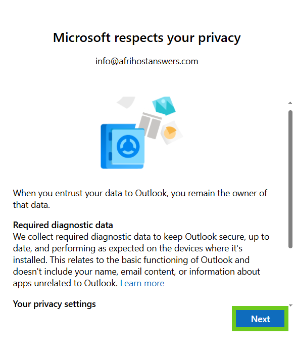 - A Microsoft privacy page will appear, select ‘Next’ to continue saving the settings.