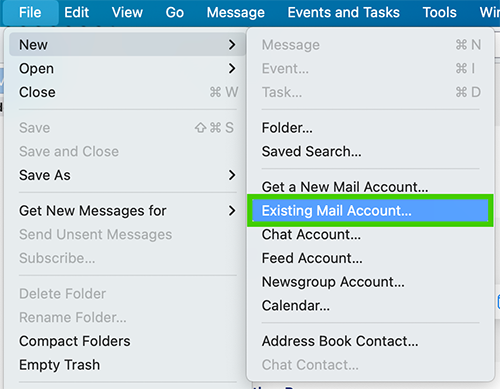 - Move across the menu and select ‘Existing Mail Account’.