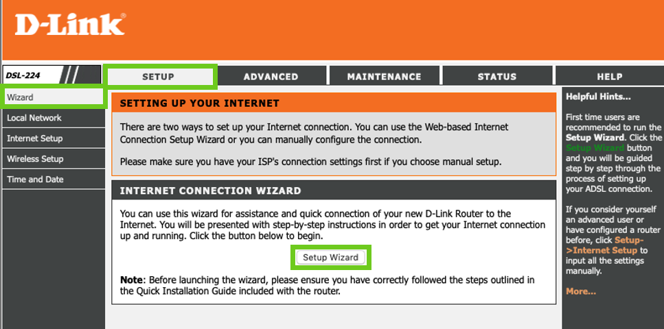 Follow the steps below to set up your D-Link 224 ADSL router: