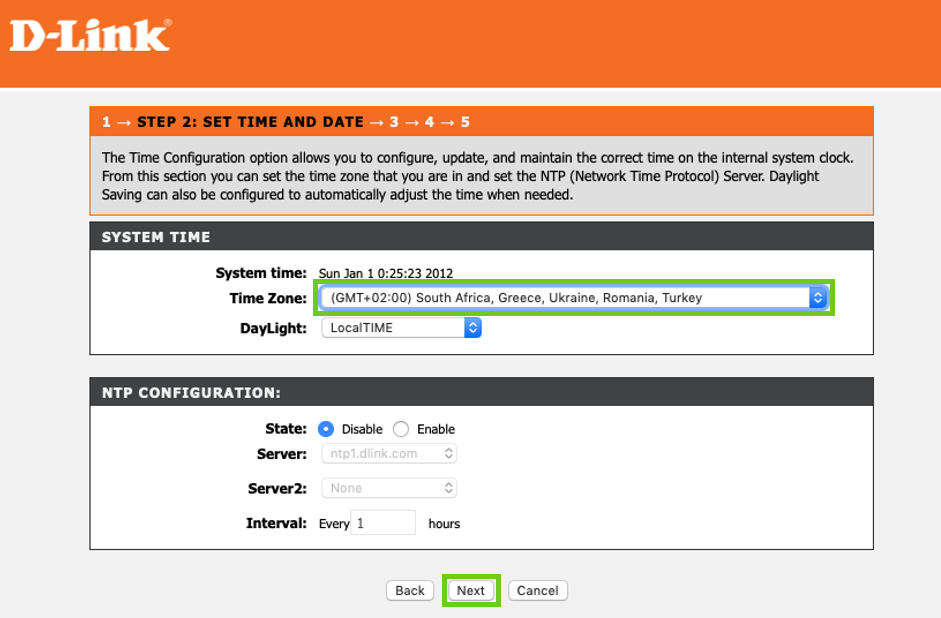 - Step 2: Set the time and date on the router. Select the correct time zone for your location. South Africa is in time zone GMT+2.
