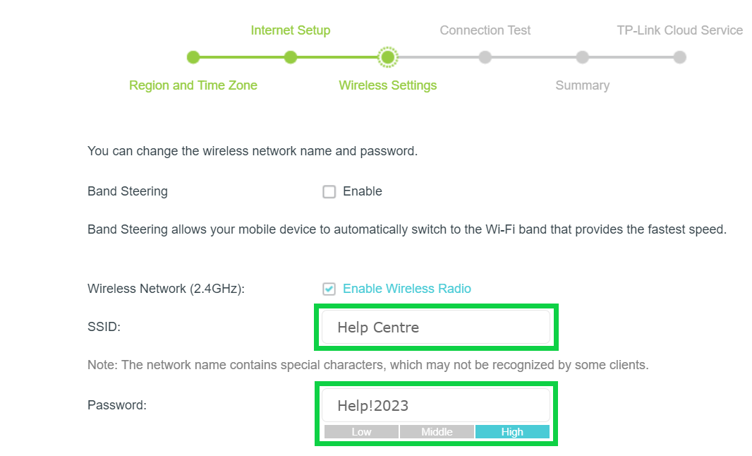 - Enter the 2.4GHz SSID (WiFi network name) and password of your choice.