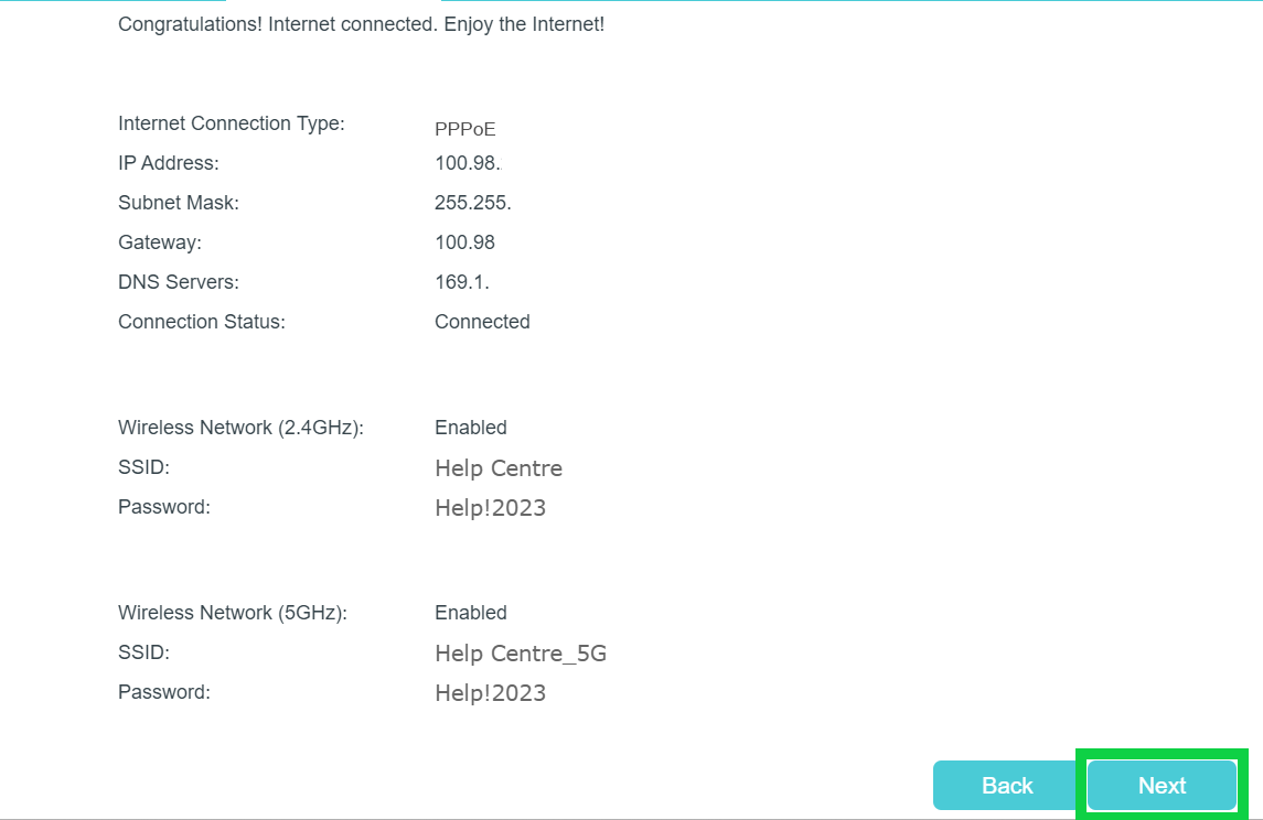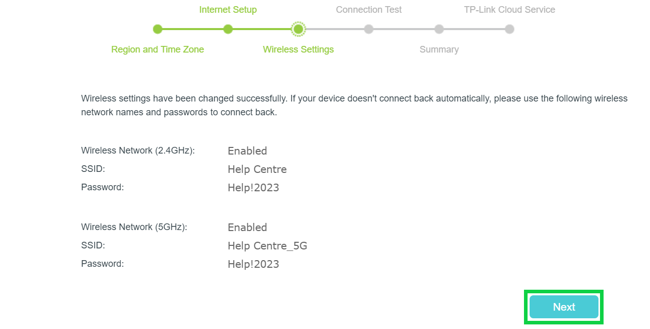 - Enter the 5GHz SSID (WiFi network name) and password of your choice.