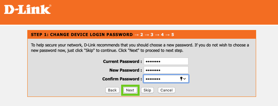 - Enter the current default password and then enter your new password to access the router. Click ’Next’.