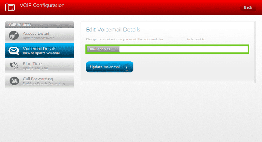 - Select ‘Update Voicemail’ to update the email address where voicemails will be sent.