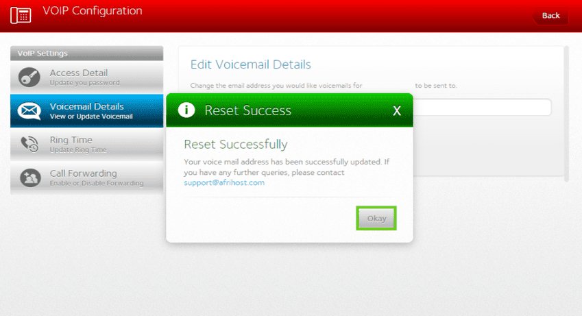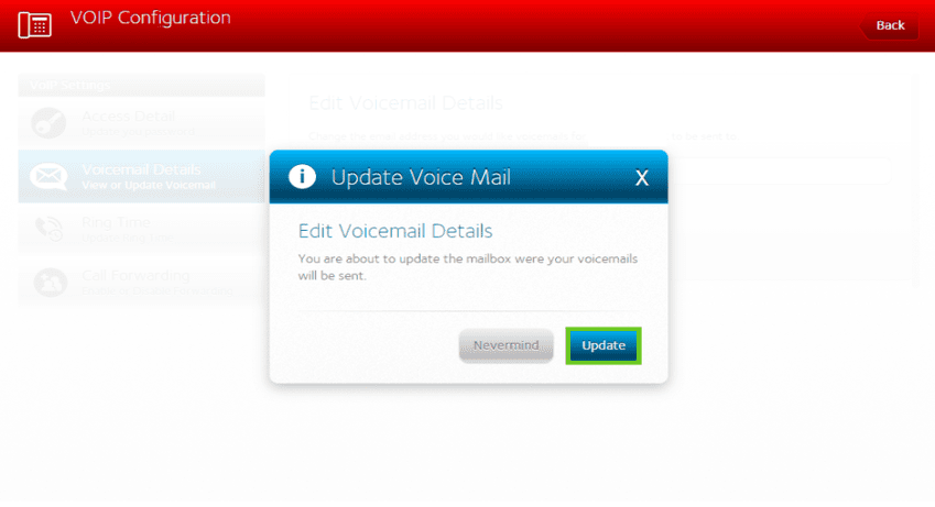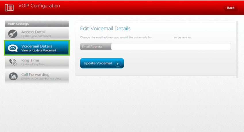 - Click on ‘Voicemail Details’ to view or update the VOIP voicemail email address.