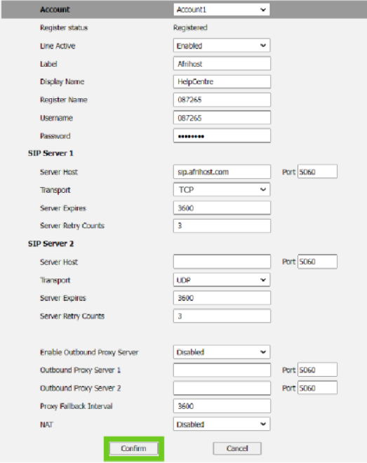 - SIP Server 1 - Server Host: sip.afrihost.com.