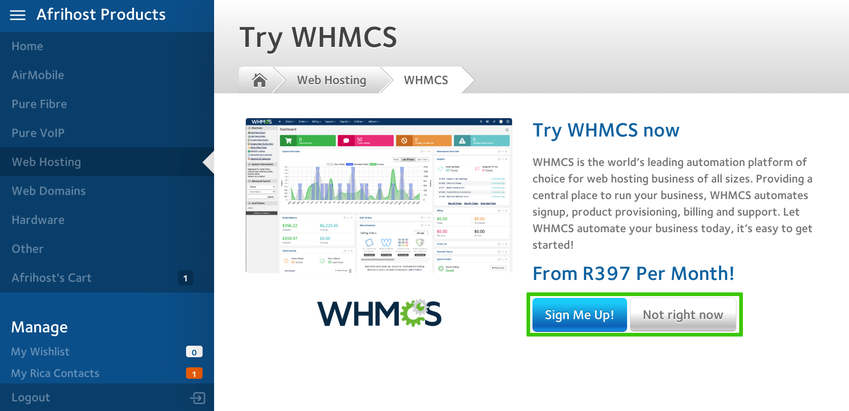- Our optional WHMCS service will appear during sign-up. To access this business management tool, select 'Sign Me Up' or choose 'Not right now' to continue.