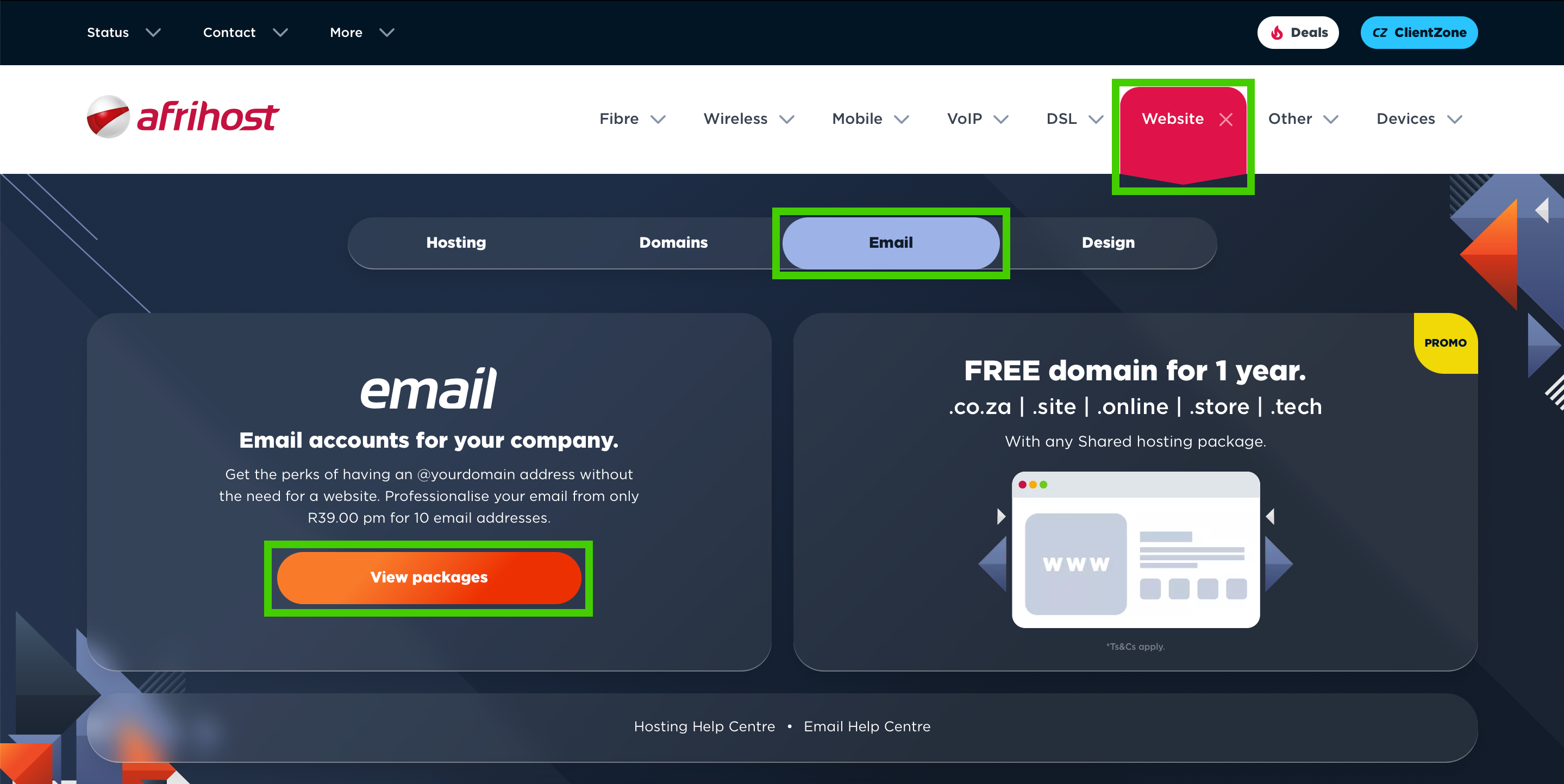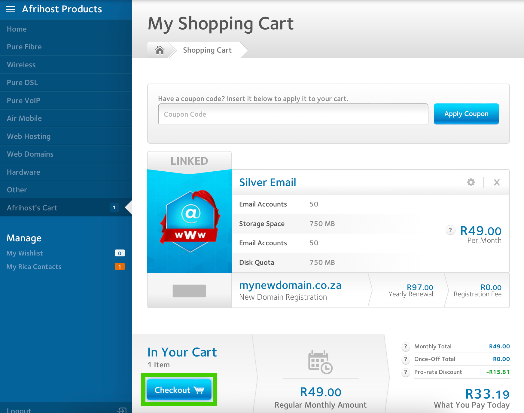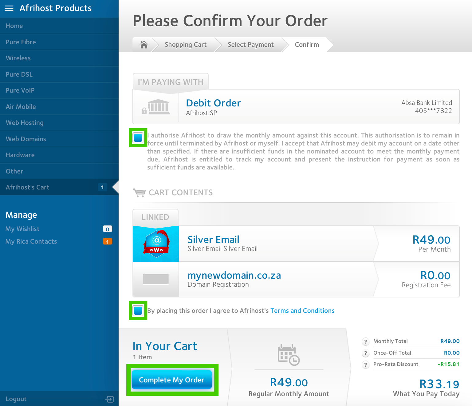 - This will take you to Afrihost ClientZone order form, confirm all details of the package are correct.