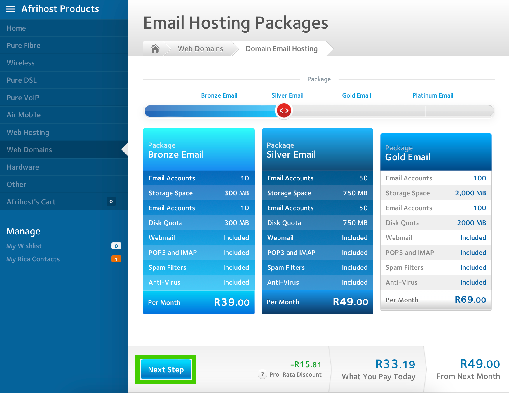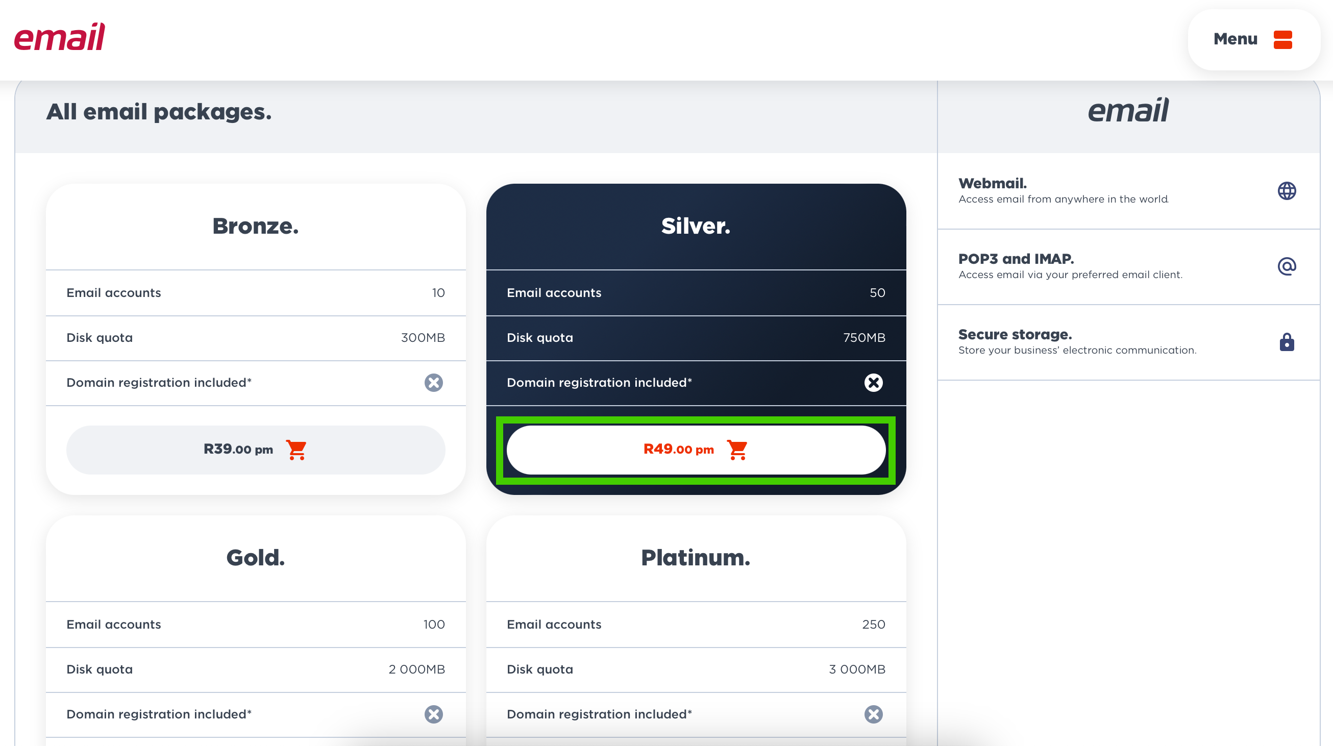 - Scroll down to view the Domain Email packages available. Select from the Bronze, Silver, Gold or Platinum Email options. Each offers different features.