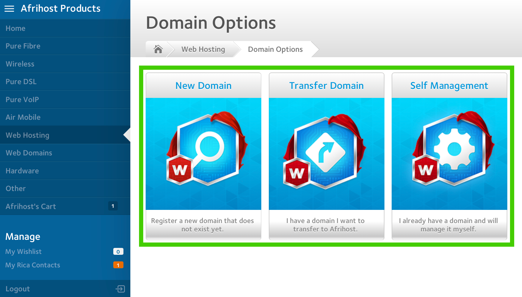 - Transfer Domain - If you are transferring an existing domain name over to Afrihost.