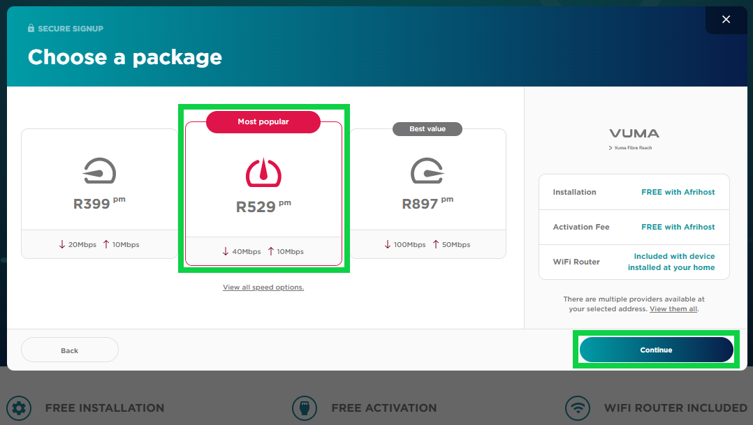 Follow the steps below to sign up for a Vuma Reach Fibre package: