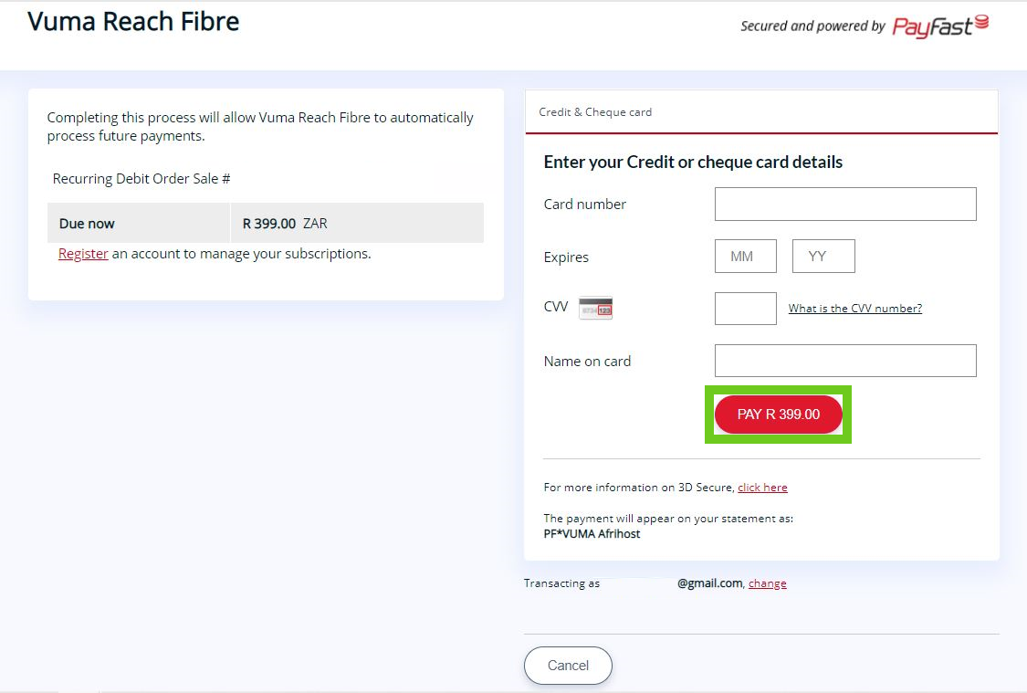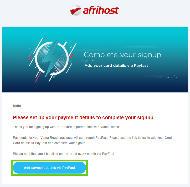 - Please check your emails for an email from Afrihost with a PayFast link to complete the sign-up process. Select ‘Add payment details via PayFast’ to continue to the PayFast page.