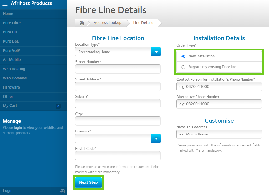 - You’ll be redirected to the Afrihost Order Form to complete the order process. Complete the Fibre Line Location details for your installation. Ensure the installation details are correct.