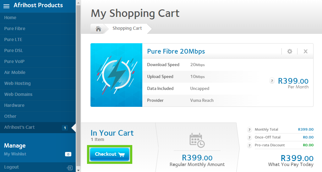 You can sign up for Vuma Reach Fibre via the Afrihost Fibre site. Please note that Vuma Reach is a prepaid product and payment is processed through Payfast and not Afrihost.