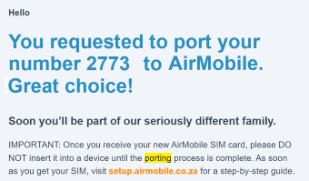 Congratulations. Your number has been successfully ported to the AirMobile network. You may now insert your new AirMobile SIM card.