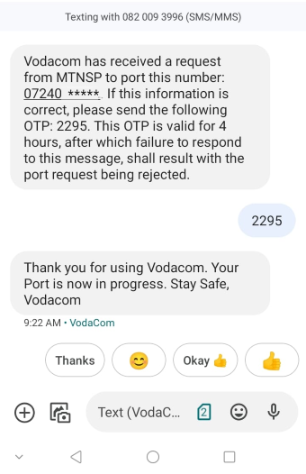 - You will receive another SMS from your current network provider confirming that a porting request has been received.