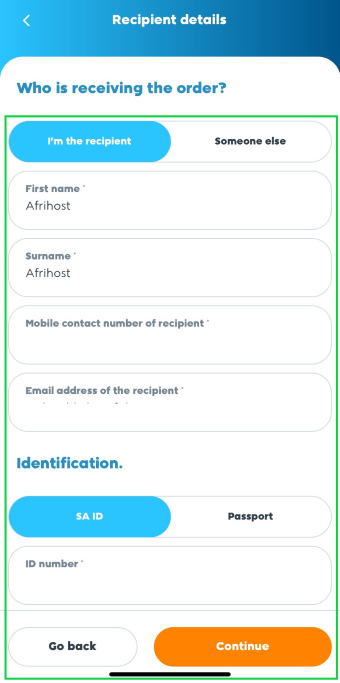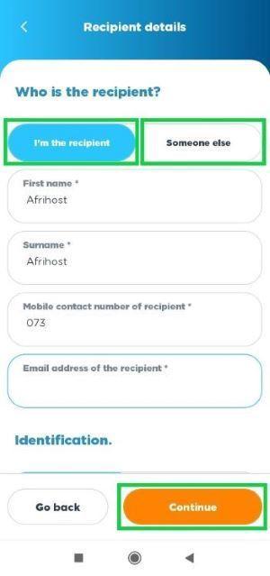 - Select a recipient - either yourself or someone else. If you opt for someone else, provide their RICA documents, not yours.