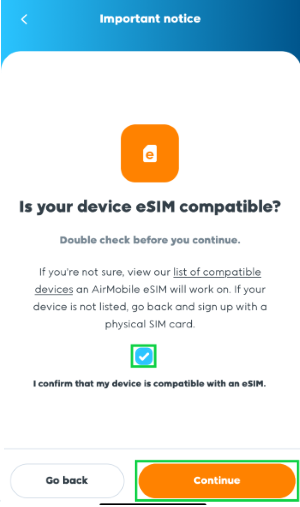- Please verify that your device supports eSIM functionality by selecting the checkbox.