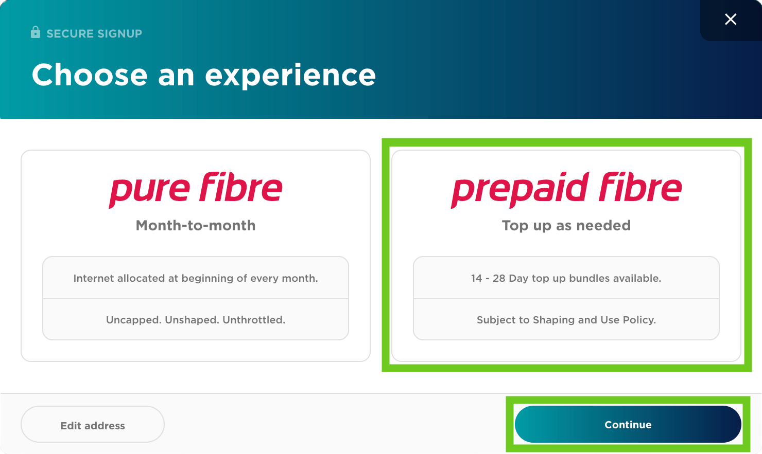 - If you have Prepaid Fibre coverage at your address, you will see two options -