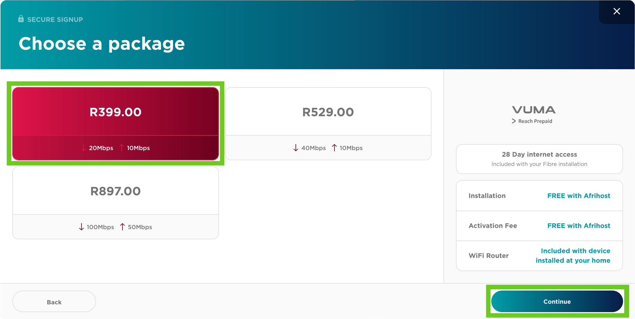 - Select Prepaid Fibre and click the ‘Continue’ button.