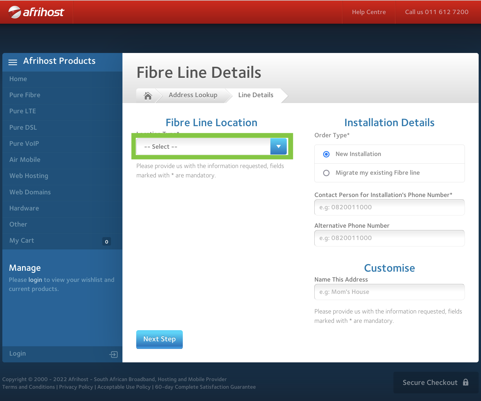 If there is already a Vuma Reach or Openserve Fibre installed in your house/unit, your Order Type will be ‘Migrate my existing Fibre line’. If you have no fibre installed, select ‘New Installation’.