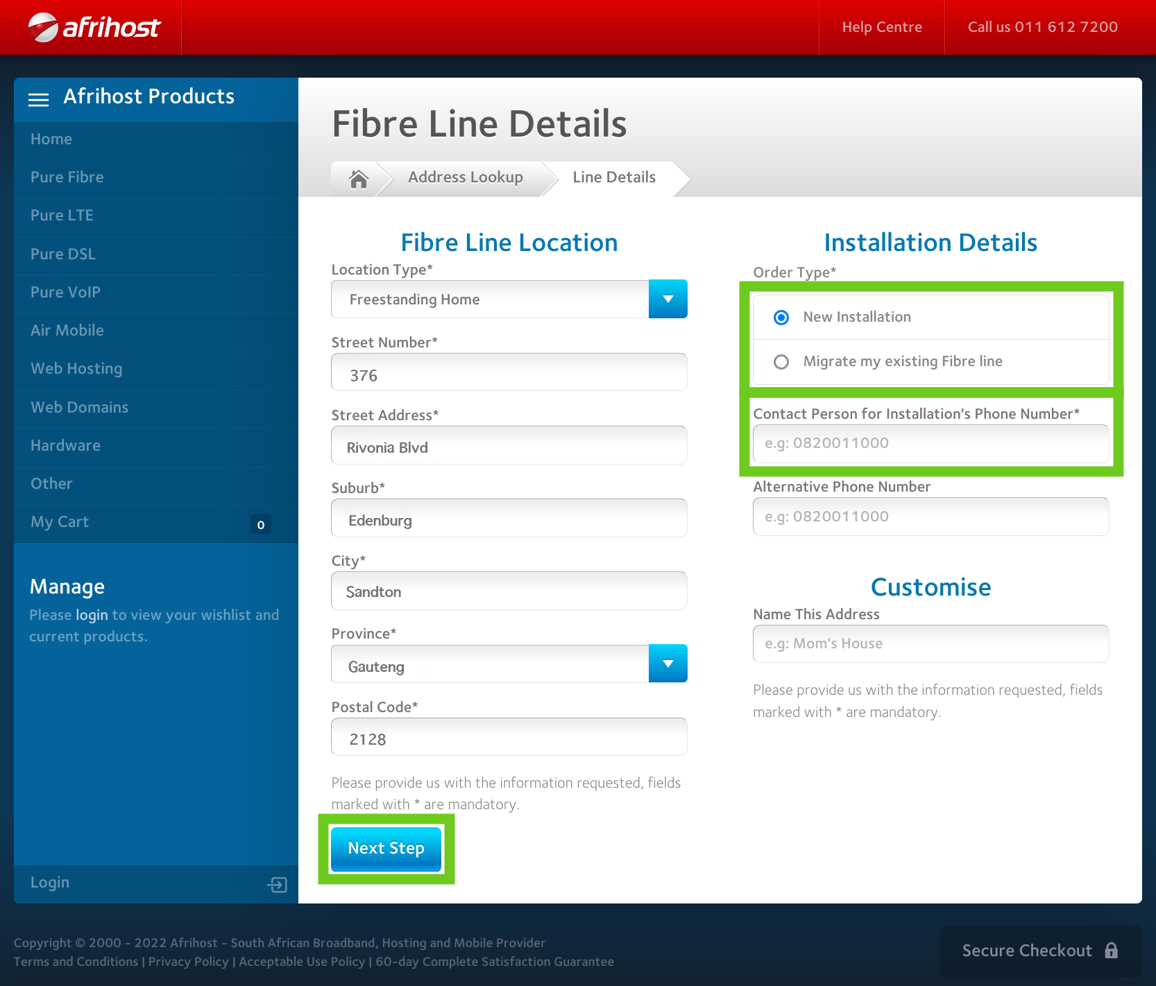 - The order form will load. Complete the Fibre installation details.