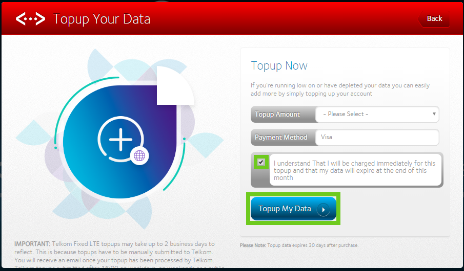 - Click on the ‘Topup my Data’ button to confirm your topup.