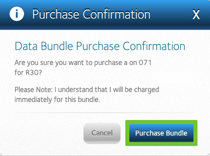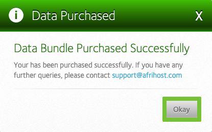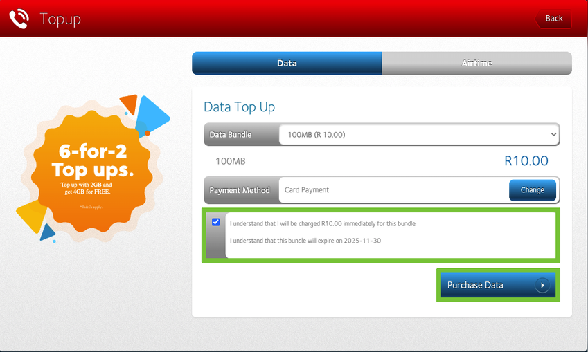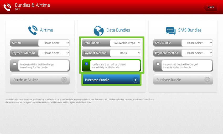 - In the data section, select the Data bundle amount and payment method you desire from the drop downs.