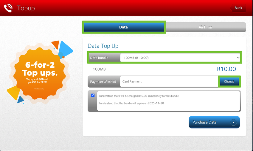 - Under the Data section, select the data top-up amount you need and ensure the correct payment method is selected. To add or change a new payment method, click ‘Change’.