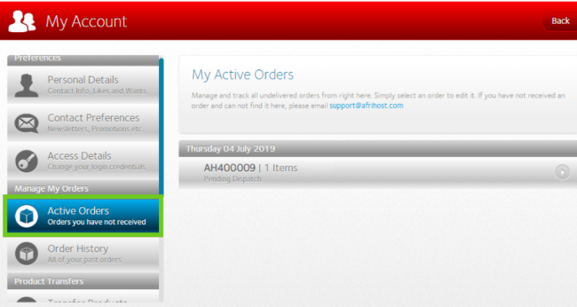 - Under ‘Manage My Orders’ in the left column, click on ‘Active Orders’.