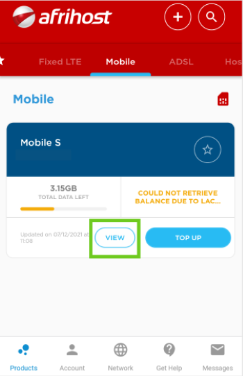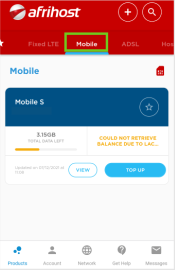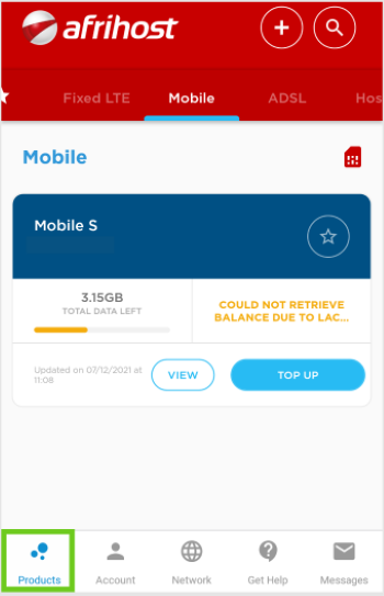 - Select ‘Mobile’ at the top of the page to view all your Afrihost mobile products.