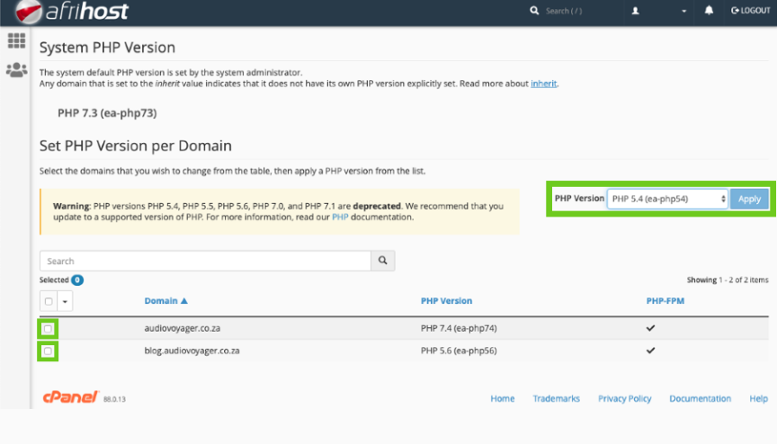 - Select the desired PHP version you wish to upgrade to from the available Php versions list.