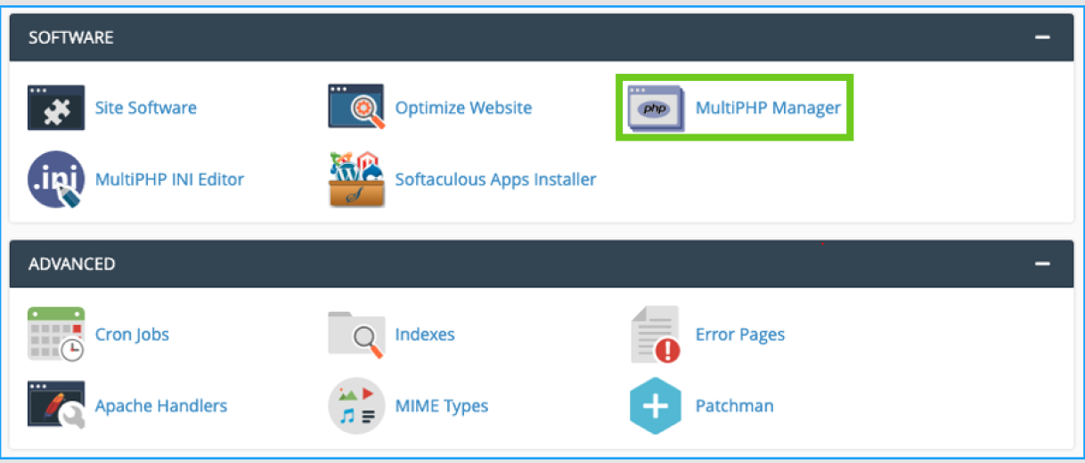 - In cPanel, scroll down and Under the ‘Software’ section select ‘MultiPHP Manager'.
