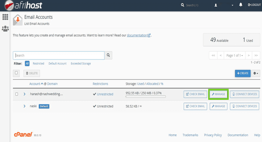 - Next to the relevant email account, select ‘Manage’ from the options on the right-hand side.