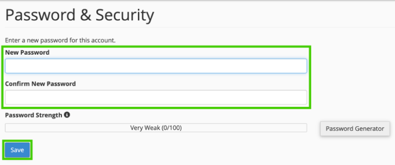 - Under the Security section, enter your new password in the ‘New Password’ field or select ‘Generate’ to have a random secure password generated for you. The drop-down arrow allows you to select the length and characters used when generating a password.