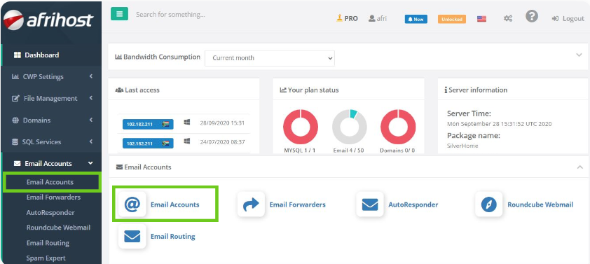 - Select ‘Email Accounts’ from the menu on the left or scroll down to the ‘Email Accounts’ section.