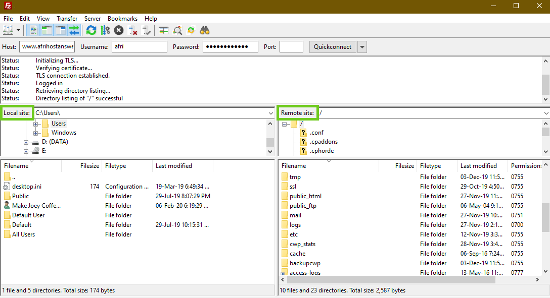 2. Once logged in, on the left-hand side under ‘Local Site’, you will find your computer files and folders and on the right-hand side, under ‘Remote site’, you will find your hosting account files and folders.
