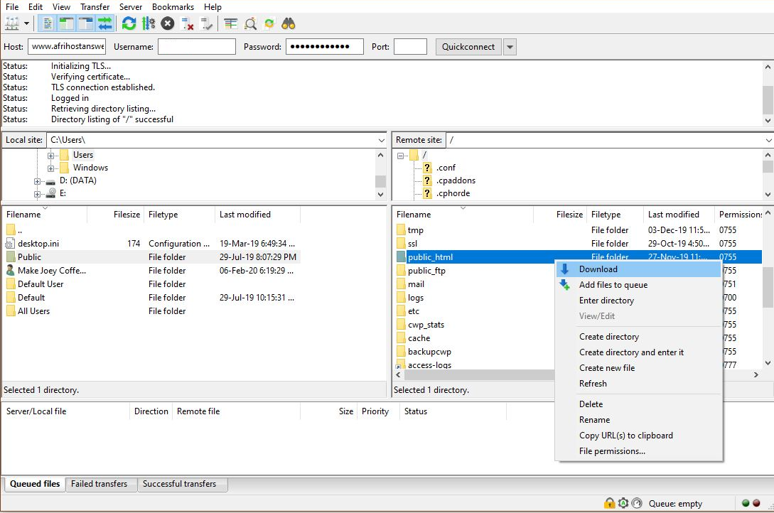 1. Select the files and folders on the right-hand side, under ‘Remote site’, right-click and hit Download.