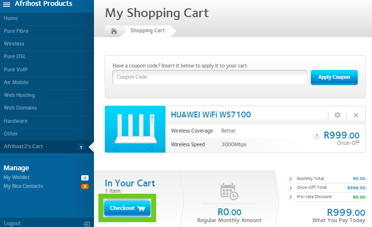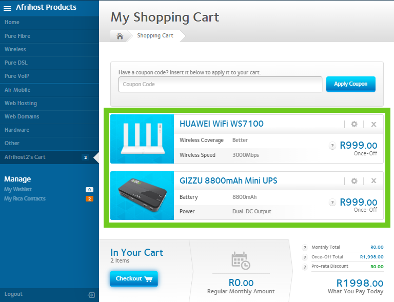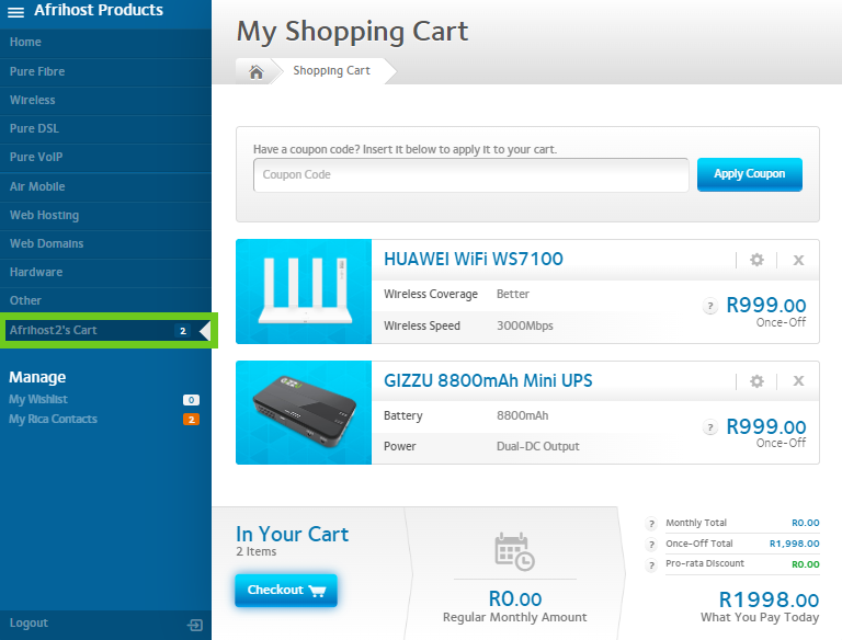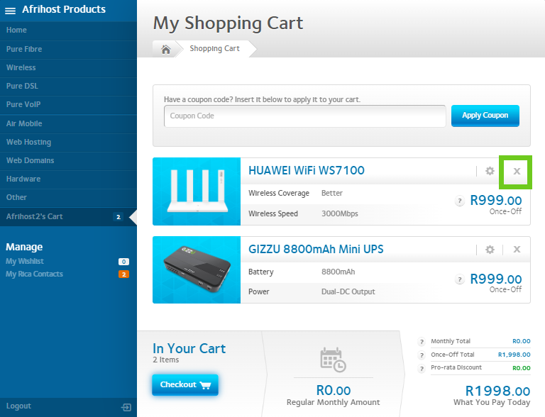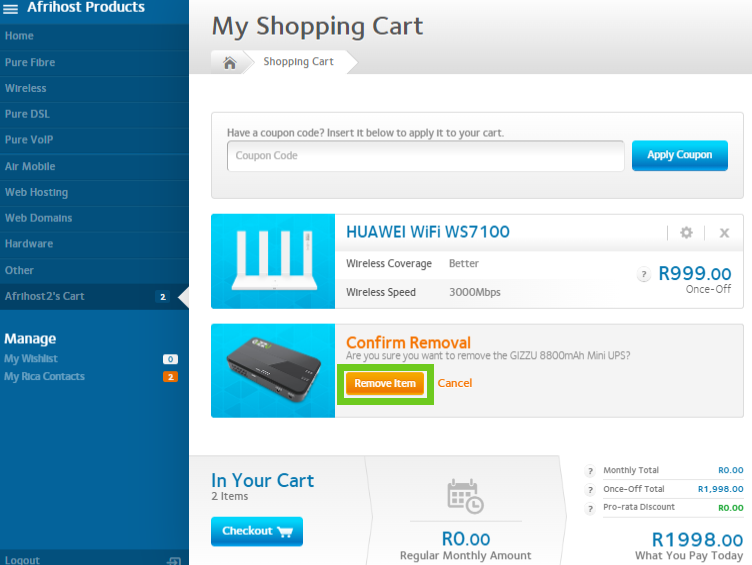 To review your selected items and make necessary changes such as deleting certain items based on your budget or ensuring you have chosen the correct item(s), you can access your Afrihost cart through the order form and edit it accordingly. The following steps will guide you through the process