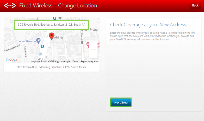 - Enter the new location's address to check coverage, once done, select ‘Next Step’ to complete the change.