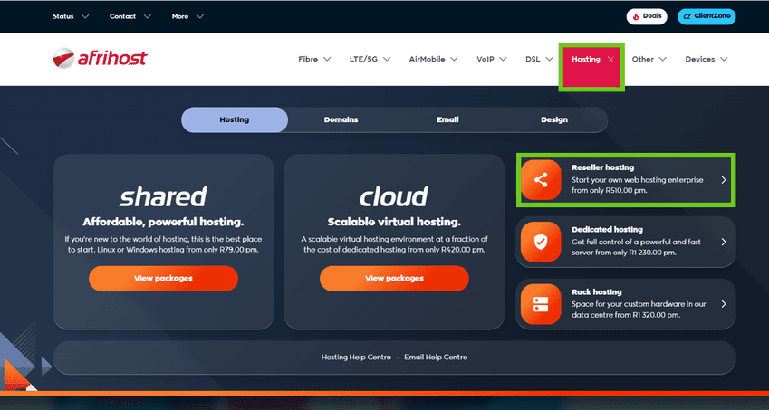 A reseller buys hosting services from Afrihost and resells it to third-party clients for a profit.