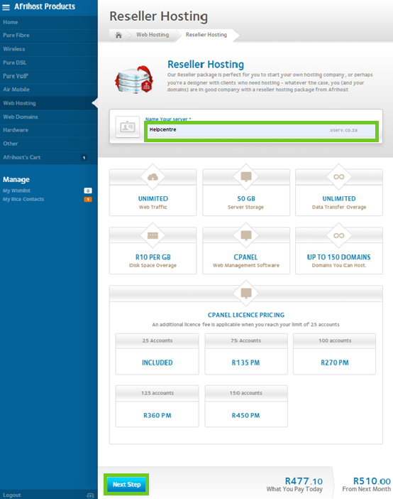Reseller web hosting is a type of web hosting. It is a service that is provided by a hosting company such as Afrihost, allocating a certain amount of disk space and bandwidth to a person or business to sell hosting services to third parties for a monthly fee.