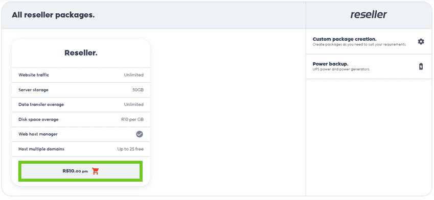 - Once on the reseller page scroll down to the reseller package. View the features of the reseller package and select ‘cart’ icon below.