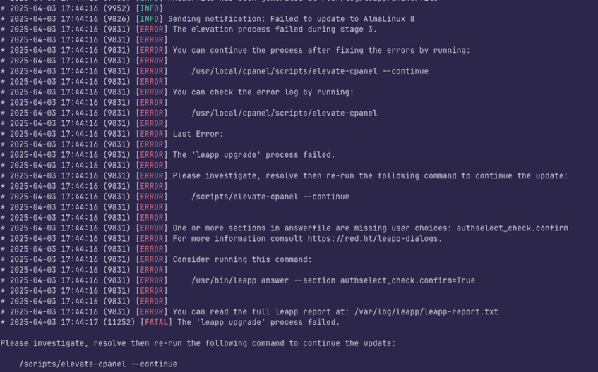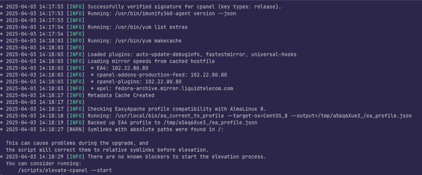 Now it’s time to download and run the latest version of the cpanel-elevate script. Use the following commands:
