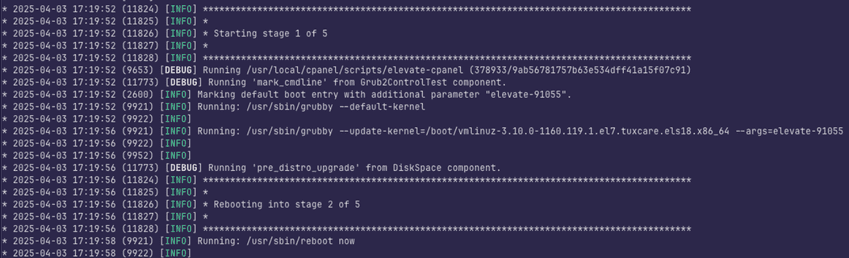 - The server will reboot multiple times. For detailed output, append the -log flag to the ELevate command.