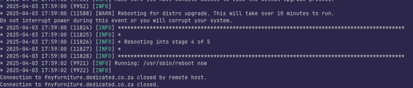 The upgrade must be performed via a terminal session with root-level SSH access to the server. During the upgrade process the system will undergo a reboot and may be temporarily unavailable until the procedure completes successfully.