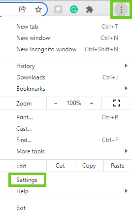 - On your browser select the menu button (three dots) in the top right corner and select ‘Settings’ from the drop-down menu.