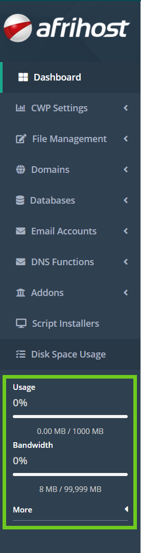 - In the menu on the left-hand side, under ‘Disk Space Usage’ will find an overview of your disk usage information.