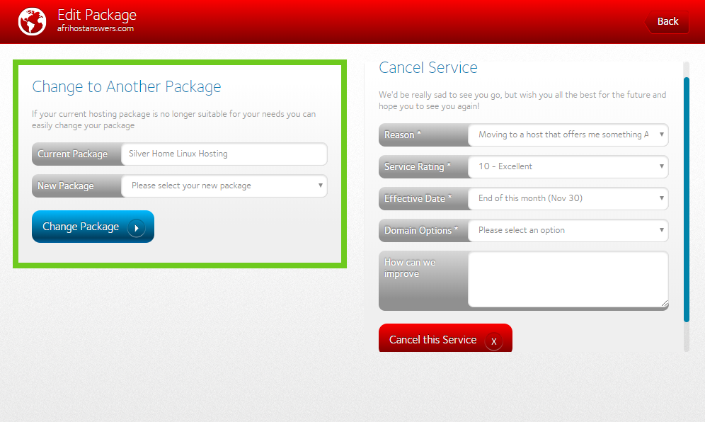 - Under New Package, select your new hosting package from the drop-down menu.